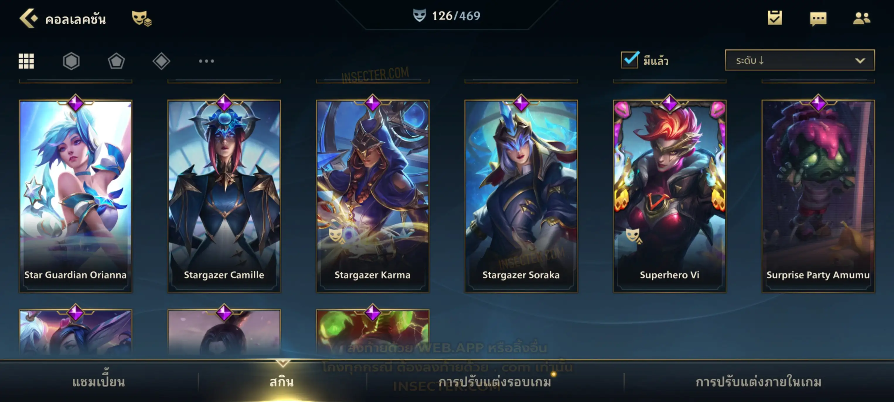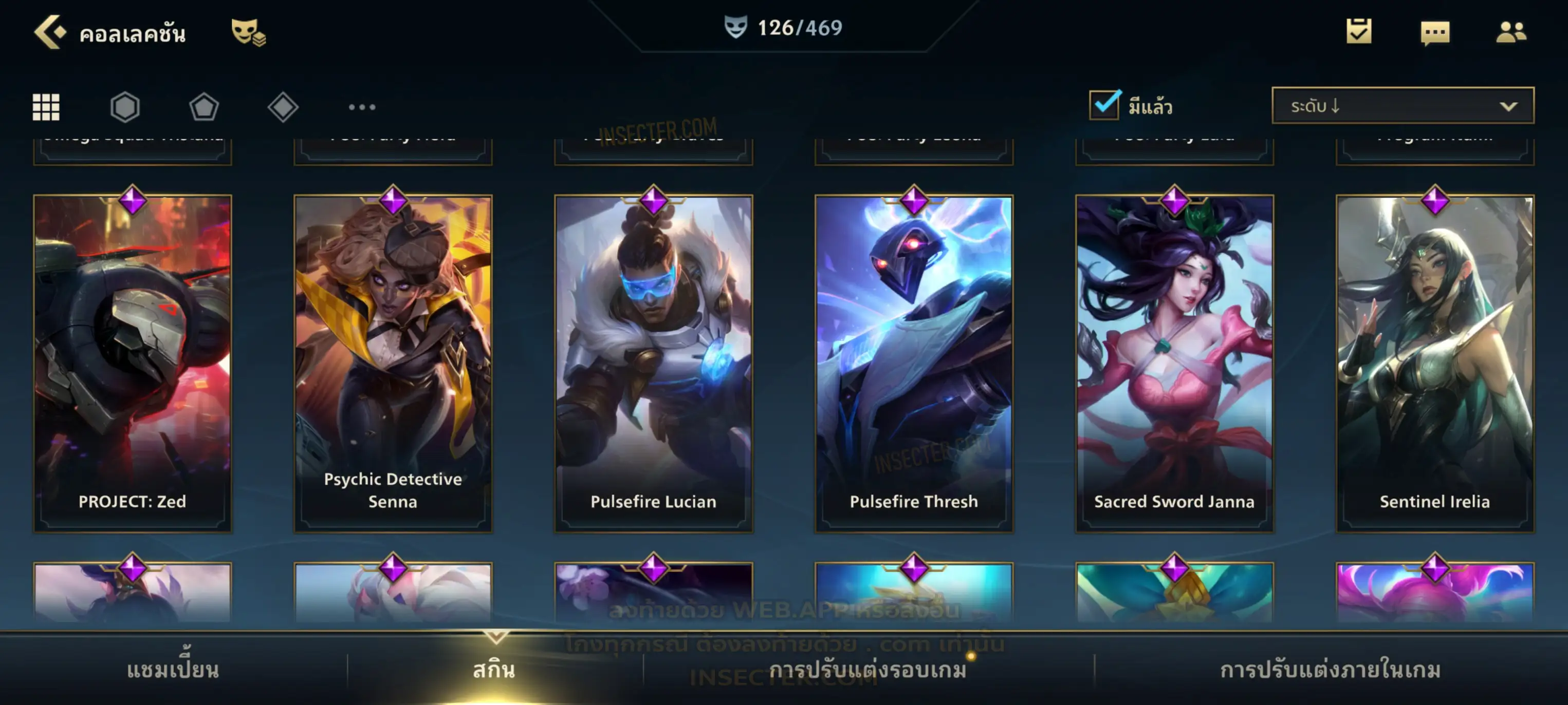 ข้อมูลย่อ : เมน MID-AD-TOP แชมครบของตกแต่งเยอะมีลิมิเต็ด 5 สกินคุ้ม ๆ จ้า ราคา 2,700 บาท 106/106 >แชมเปี้ยน 126 >สกิน 20 >Legendary (กรอบลิมิเต็ด 3 กรอบ) 69 >Epic (กรอบลิมิเต็ด 3 กรอบ+ท่าโพสพิเศษ 3 ท่า) 37 >อื่นๆ (กรอบลิมิเต็ด 6 กรอบ + ท่าโพสพิเศษ 2 ท่า)