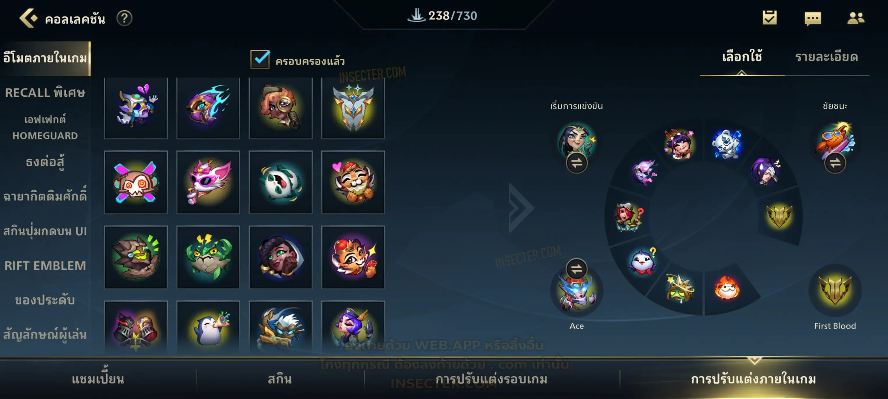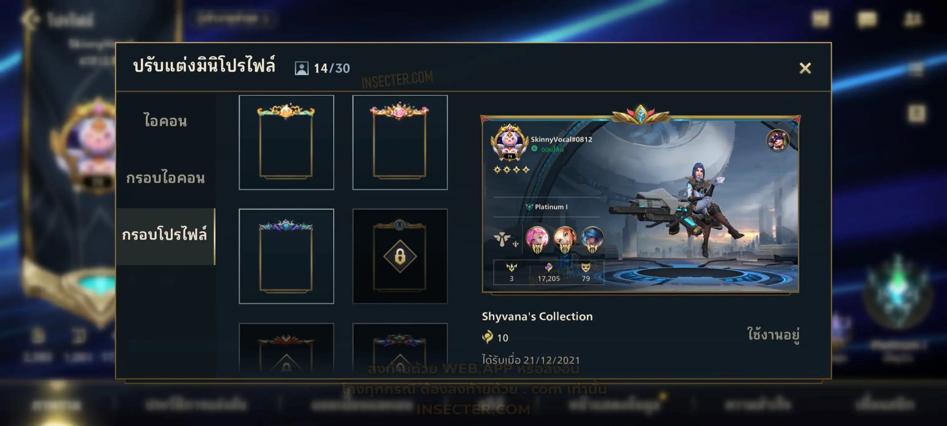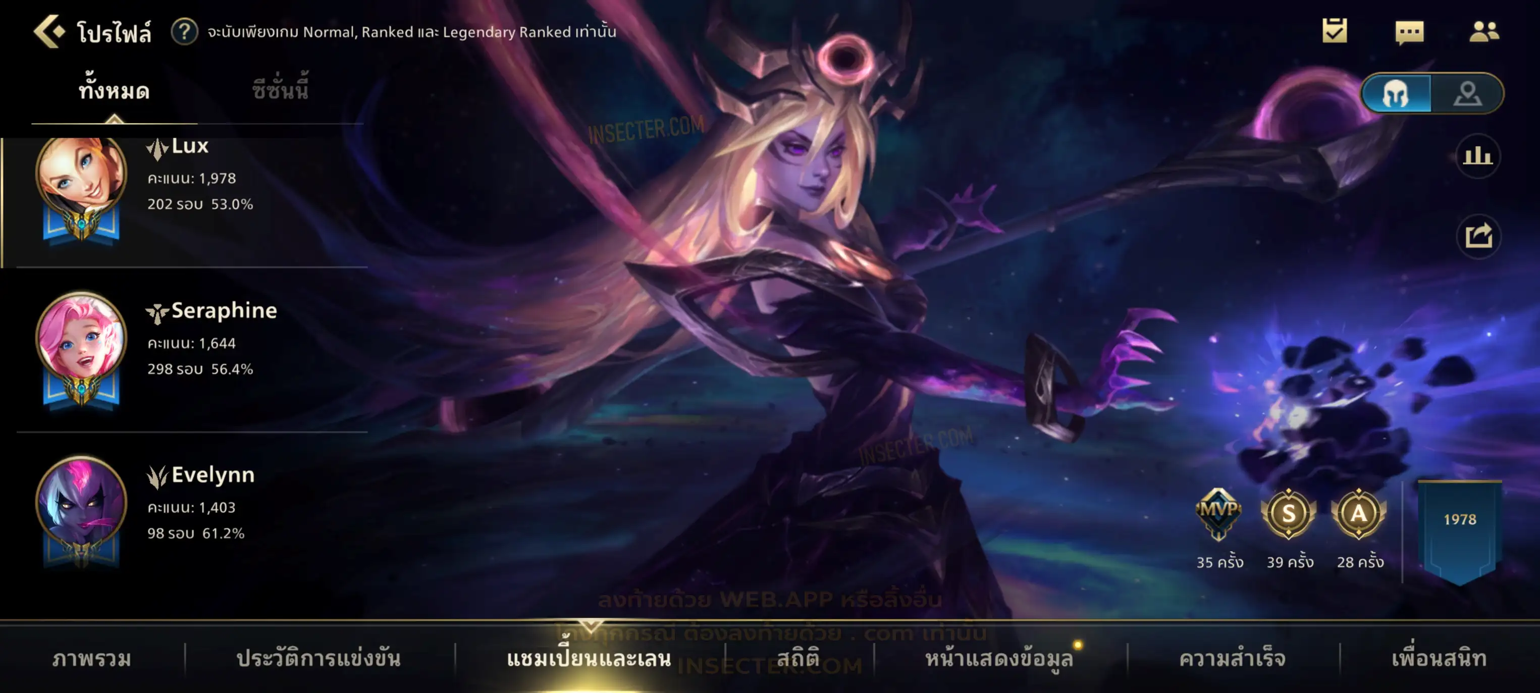 ข้อมูลย่อ : เมน MID-SUP-AD แชมเยอะ เน้นสกินผู้หญิงสวย ๆ คุ้ม ๆ เลยจ้า 96/105 >แชมเปี้ยน 79 >สกิน 7 >Legendary (กรอบลิมิเต็ด 2 กรอบ+ท่าโพสพิเศษ 2 ท่า '' เป็นแบบกดในเกมได้ 1ท่า '') 45 >Epic (กรอบลิมิเต็ด 6 กรอบ+ท่าโพสพิเศษ 3 ท่า) 27 >อื่นๆ (กรอบลิมิเต็ด 7 กรอบ+ท่าโพสพิเศษ 2 ท่า)